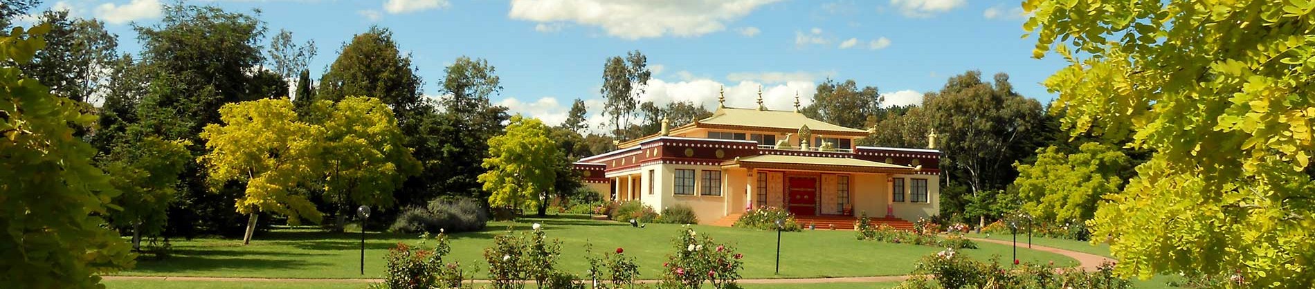 Of the 7.3265 trillion images crossing our mind on an average day in samsara, there is one with a special place. It comes as we enter the Tibetan Buddhist Society and walk the winding way by lake, lawns, flowers and trees. As we walk there is a softening of samsara. The West Bank, the brutality of Baghdad, Canberra’s conambulations, the constant emotional tug of family and finance: all begin to subside. As the clamour of the cricket and the ferment of the football fade to the background of mind, we look up to the beautiful image of our Temple, our sacred space. The associations of our traditional Tibetan temple begin to open their network of dependent arisings. Here is the place of our Dharma teaching, the environment within which we make most meaningful contact with our Guru, seated in stillness, listening to his Dharma. We receive his blessing and empowerment here, and stay with him in retreat. Shakyamuni Buddha towers above, a statue filled with the blessing of vajra body, speech and mind. In surround are forty-seven images of enlightenment, silk thangkas in sets of the two supreme masters and seven sage ornaments, as well as Manjushri, Maitreya, White Tara and so forth. The temple, and the statues and thangkas that he has brought to it, are Geshe Acharya Thubten Loden’s vision made manifest, his offering to the Australian people. The image we have of our temple is therefore not just that of a building, but of a special environment, a sacred space, and an especially potent symbol of the Dharma. The gold painting of the roof and porch, the Dharmachakra, deer, victory banners, spires and lotus petals, and the decorative painting are all reminders of the Dharma. They are found in the traditional Tibetan temples of India and Tibet. As we approach the temple from the front, the symbolic features strike us immediately. Over the front entrance to the temple is a Dharmachakra flanked by two deer representing compassion and peacefulness. The deer gaze up at the Dharmachakra symbolising the aspiration for the Dharma. The Dharmachakra, or the wheel of Dharma, represents the three turnings of the wheel of the Dharma by Shakyamuni Buddha. Such is the Dharma wheel, which destroys all obscurations: the obscurations to liberation and the obscurations to omniscience. As we observe the building we notice that around the parapet are golden disc-like ornaments each of which is a representation of one of the Eight Symbols of Good Fortune and the Five Qualities of Enjoyment. As we enter the temple we are enthralled by the huge golden Buddha statue. The statue holds the script of over six million mantras rolled and positioned in the prescribed places within it, as well as the holy relics from His Holiness the Dalai Lama placed at the heart and crown. The statue positioned on the altar and lion throne stands 18 feet high. It is made of copper and painted with gold. The hair treasure is a blue topaz. The majority of the relics was given to Geshe Loden by His Holiness the Dalai Lama and includes a small Thirteen Deity Yamantaka statue, five Shakyamuni Buddha relic pills, hair relics from the progression of reincarnations of the Dalai Lamas, and a tsa tsa collecting all blessings. The temple is now blessed by the presence of the Tibetan canon of the Translated Word (Kagyur) and Translated Commentaries (Tengyur).The translated word is the texts of the collected sutra and tantra teachings of Shakyamuni Buddha and can be considered to represent the Buddha’s holy speech. The Translated Commentaries are the collected works of the great Indian Pandits, such as Nagarjuna, Asanga, Chandrakirti and so forth. Our temple then is a beautiful dependent arising, of design, craftsmanship, symbolism, Buddha image, thangkas, the Buddha’s Word, and the vision of our spiritual leader. It is our place of Dharma, of teachings, empowerments, blessings, tantric pujas and retreats. It holds the hope of enlightenment, the welfare of beings, and extends the opportunity of truth to all who would hear. Unique in a world of turmoil, precious image in our minds, it is our sacred space.